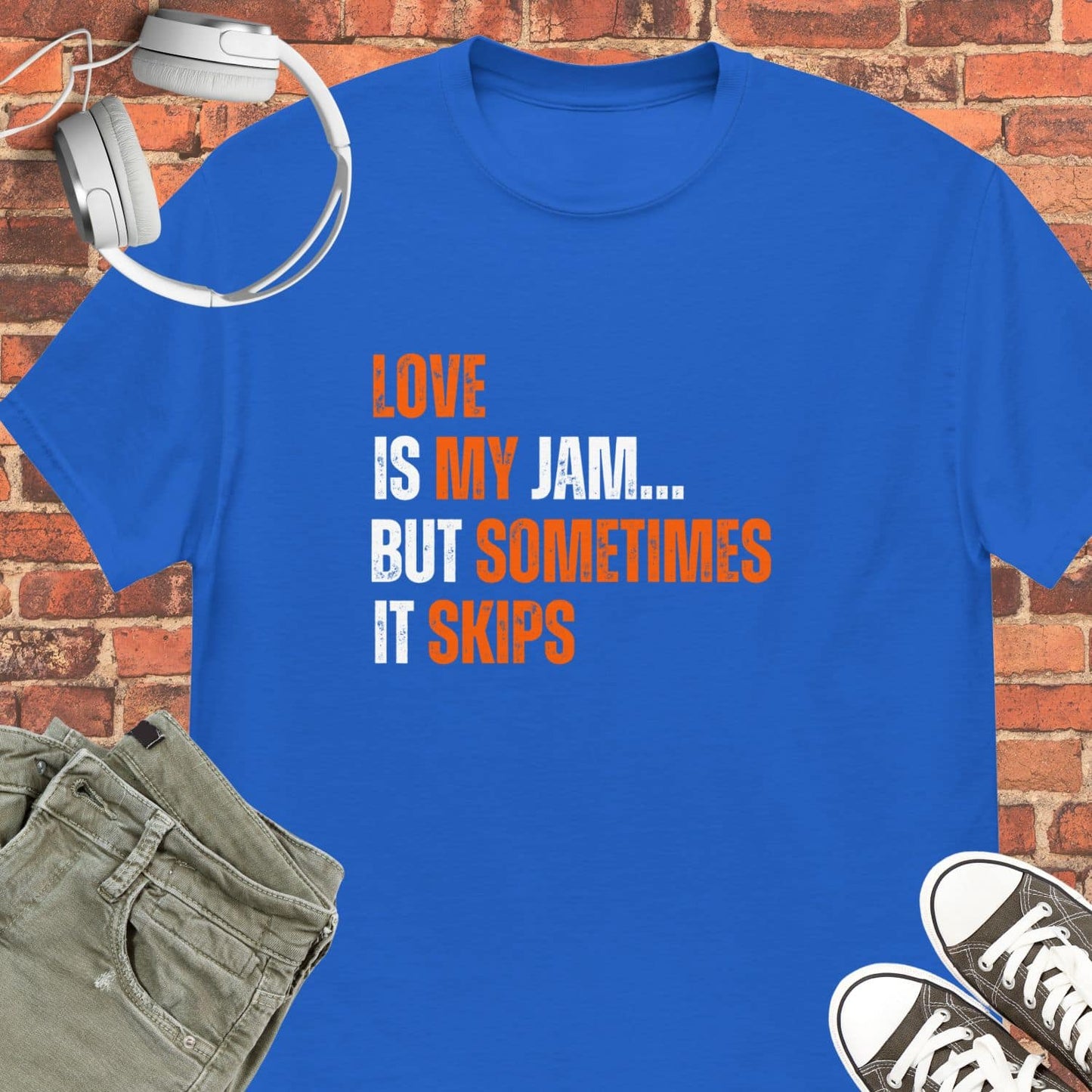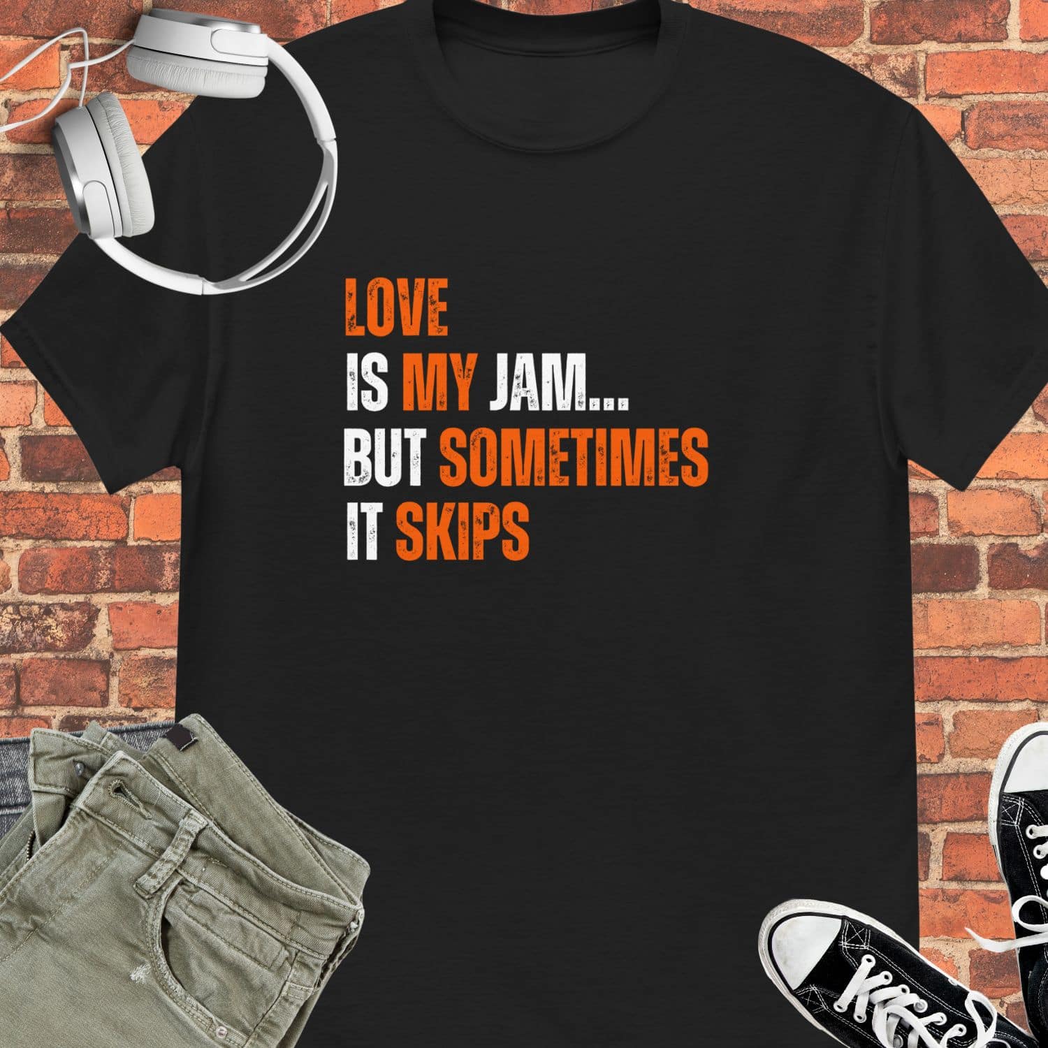 Show your funny side with our Love is My Jam Unisex tee! This funny and romantic shirt is perfect for romantic people and music lovers, Because you still believe in love. Get your tee now!