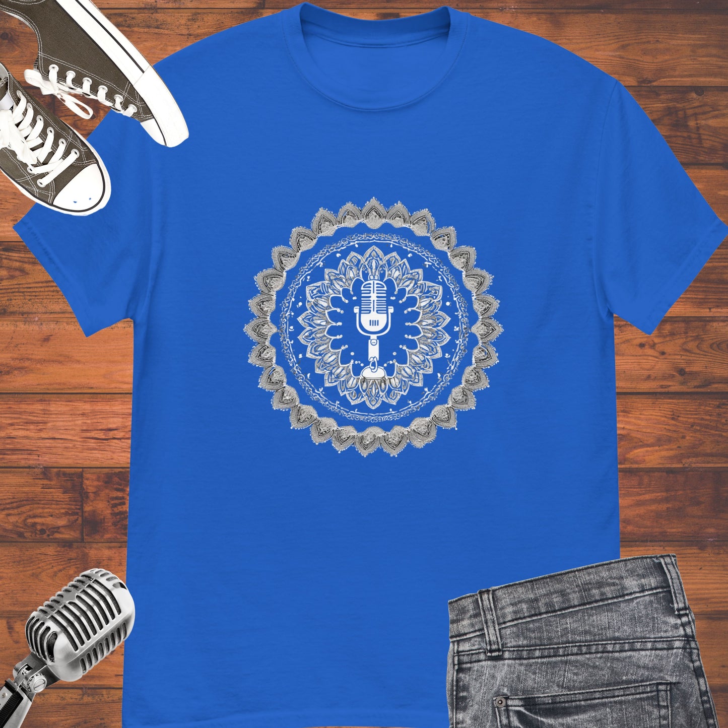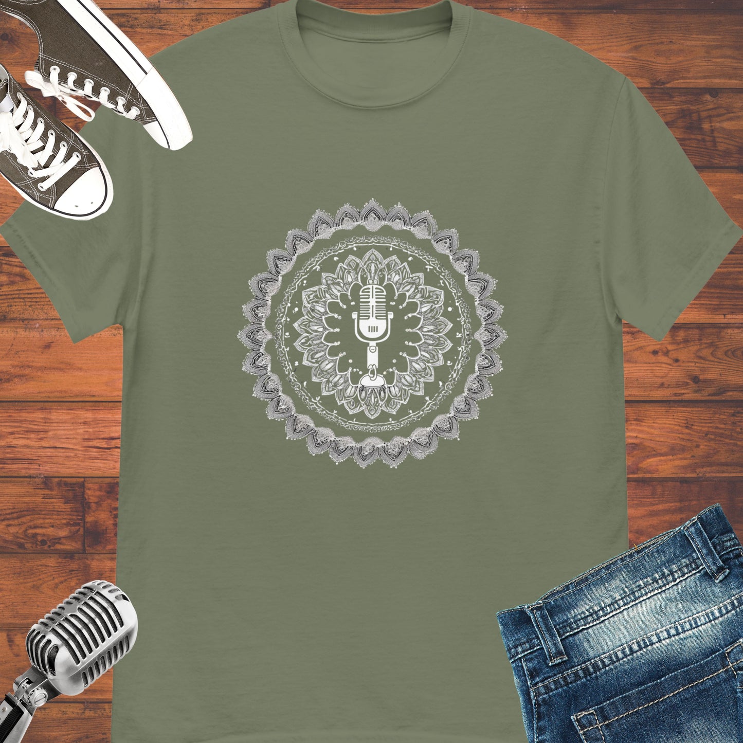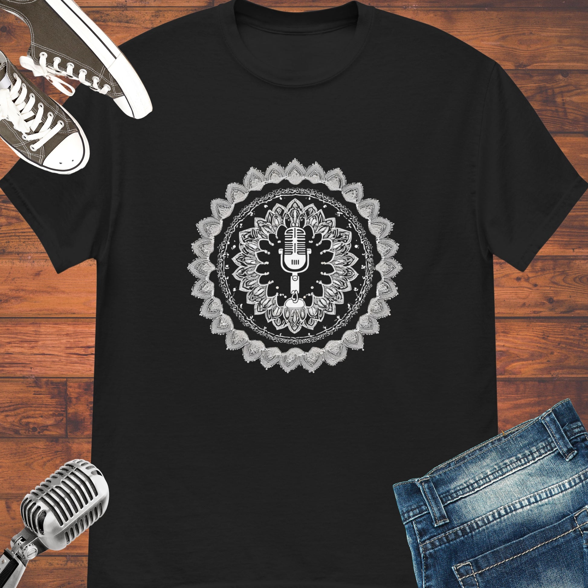 Elevate your style with our Microphone Mandala Unisex tee. This unique design incorporates a microphone into a stunning mandala to show your love for music. Made with high-quality fabric, it's comfortable to wear and perfect for singers or any music lover. Spread happiness and music wherever you go with this must-have merch. Get your tee now!